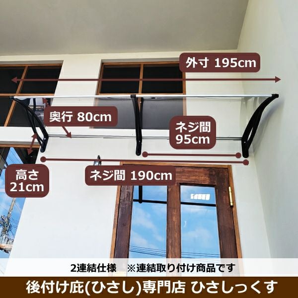 他の画像を見る 横幅195cmの大きめ庇 2連結タイプ 【本店限定 2,000円引き】Xモデル195 クリアボード(2連結仕様) W(幅)195cm × D(奥行)80cm 定価 ¥ 32,800 のところ 当店特別価格 ¥ 30,800 税込 詳細を見る お気に入りに登録する